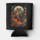 Can cooler with a cool looking owl with a piercing stare. A full moon in the back with a garden of red flowers.