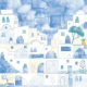 Uma pintura de aquarela azul e branca da aldeia de Oia, na ilha grega de Santorini. Arte original de Nic Squirrell.