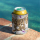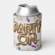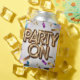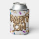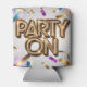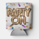 This is a pretty festive Can Cooler with metallic gold letters, confetti, sparkles, lights, bubbles and more. This Can Sleeve has metallic gold letters spelling PARTY ON on a gray background with colorful streamers and sparkles. The text has a glossy, reflective effect with light reflections and sparkles. The background features scattered confetti pieces in gold, purple, and turquoise colors. There are also floating transparent bubbles and sparkles creating a festive atmosphere. The Can Sleeve is made of polyurethane foam. The can cooler is made for twelve ounce cans.