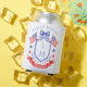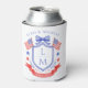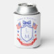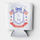 This patriotic wedding can cooler design features a watercolor crest with a light red white and blue patriotic crest with American flags and a blue bow. You can personalize with your monogram, wedding date and names.