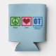 Um presente de Natal fofo para terapeuta ocupacional com um sinal verde de paz, coração vermelho e OT escrito em azul sobre fundo azul. A terapia ocupacional é uma ocupação tão importante. Ajuda tanto adultos como crianças com terapêutica sensorial.