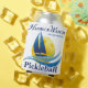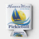 A liga de reconhecimento de picleball do Harbor Watch joga no adorável lago Murray, onde jogadores frequentemente vão para uma vela e depois se encontram e jogam piquenique. Neste design, um veleiro azul desliza através de ondas com um sol amarelo no fundo.