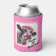 Uma lata/garrafa/seltzer balbuciosa e divertida, aconchegante com um fundo rosado e branco polka pontilhado, uma vaca branca e negra vestida vestindo óculos rosa, vestido rosa e pérolas. O cadarço ao redor da vaca e o ditado, Pucker Up ButterCup! no canto.