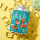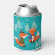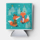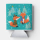 Duas Raposa Vermelha vestindo inverno quente, chapéu, suéter e cachecol. Pinheiros e neve em queda.