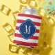 Uma lata ou um refrigerador de garrafas elegante, com um padrão de listras vermelho e azul patriótico. Personalize-o com um monograma personalizado ou outro texto em um quadro quatrefoil quic. Clique em Personalizar para alterar o texto e as fontes para criar uma oferta exclusiva ou de um tipo de oferta ou favoritos para a sua festa de CHURRASCO de 4 de julho!