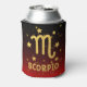 Coozie personalizado / pode resfriar para "Scorpio" com símbolo zodiac do ouro, estrelas douradas e fundo de gradiente vermelho e preto.