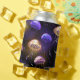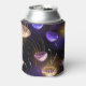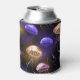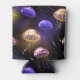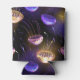 Padrão constante de águas-vivas brilhantes, ouros, roxas, desenhadas artificialmente, brilhantes sobre fundo do mar negro. Água-viva brilhante.
