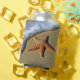 Fotografia de praia impressionante, um peixe-estrela laranja brilhante na borda das águas prestes a ser coberto por uma onda suave.