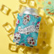 Um design de cor pode arrefecer para o Dia das Festividades Mortas, apresentando uma variedade de crânios decorativos de açúcar com sotaques de flores e espirais sobre um fundo azul de turquesa de efeito texturizado. Se preferido, o banner e a camada de texto 'Feliz Dia de los Muertos' fornecidos podem ser excluídos para usar este design para outras ocasiões. Procure ID725 para ver outras opções de cores e produtos com este padrão divertido.