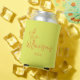 This trendy can cooler features a modern chartreuse and orange design with elegant script lettering, making it a stylish choice for wedding favors or party celebrations.