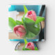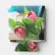 Tulipas cor-de-rosa macia num vaso de vidro decoram a parte superior de uma mesa