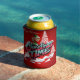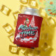Um elfo animado de desenho animado com roupas verdes e orelhas pontiagudas ondas de uma paisagem nevada. As palavras "Horário de Natal" são escritas em letras grandes, coloridas, em estilo de grafite, com um esquema de cor rosa e azul. O fundo é vermelho vivo, sugerindo uma atmosfera festiva de férias. Os flocos de neve caem suavemente, adicionando ao toque de inverno.