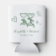 Romantic wedding can cooler featuring whimsical hand-drawn green illustrations of a heart, stars and toasting wine glasses and the names of the bride and groom in a playful green script.
