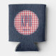 Estampa de jeans azul escuro e moldura circular xadrez vermelha e branca clássica vintage cobre este cooler de latas moderno com iniciais finas elegantes e nome moderno em azul escuro. Altere facilmente o nome e as iniciais usando o modelo fornecido. Cabe latas padrão de 12oz. Tecido durável e fácil de limpar durará por anos e manterá sua bebida gelada. Material de espuma colapsável facilita o armazenamento. Veja "Sobre" para mais informações.