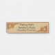 Colchete em ângulo direito, com três folhas de tamanhos variados, senta nos cantos superior esquerdo e inferior direito. Personalizar com Nome Comercial, Nome Pessoal e Título. A imagem é vermelha/marrom escura em fundo bronzeado.