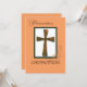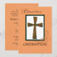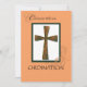 Um belo cartão de convite com uma cruz metálica sobre fundo branco, verde e rosa. Celebrar uma Ordenação e enviar bênçãos num dia muito especial. Um cartão cristão sobre fé e uma grande mudança.