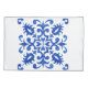 Elegant blue and white Portuguese ceramic tile featuring a central round medallion and simple round floral ornaments in each corner. Inspired by classic Lisbon tilework, this clean and timeless design is perfect for customization — ideal for names, dates, or meaningful phrases.