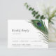 Um conjunto minimalista, porém lindo, de cartões de resposta de RSVP de casamento, apresentando uma elegante pena de pavão acima das informações e detalhes do seu casamento.