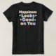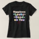 camiseta preta alegre com uma mensagem positiva e otimista que lê "Felicidade é Boa em Você" em texto colorido e brincalhão. A camisa está sendo modelada por uma mulher de cabelo comprido que sorri para a câmera, incorporando perfeitamente o sentimento positivo expresso no vestuário. A design de t-shirt destaca-se em relação ao seu fundo preto, com o texto brilhante e multicolorido a criar um contraste vibrante que desenhar a atenção para a mensagem elevatória. O estilo casual da camisa a torna versátil para o veste cotidiano enquanto estimula a positividade aonde quer que você vá.