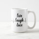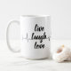 Comece seu dia com positividade usando esta elegante caneca branca com a frase inspiradora "Live Laugh Love" realçada por um design de linha de batida cardíaca. Sua tipografia negra minimalista sobre um fundo branco limpo o torna perfeito para café, chá ou como um presente pensativo. Um lembrete na moda para aproveitar a vida, apreciar o riso e abraçar o amor todos os dias. Ideal para casa, escritório ou como um presente significativo para amigos e familiares.