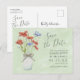 Rustic salva o cartão postal com um buquê de flor silvestre a aquarela, como papoila, girassol e grama, em um boião branco.