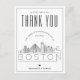 Aqui está uma maneira excelente de mostrar seu apreço aos convidados que viajaram tão longe para vê-lo, na maravilhosa cidade de Boston, Massachusetts! Este obrigado especial que você faz no postal apresenta uma linha do estilo deco moderno da cidade na frente do cartão com os nomes do casal casado embaixo. No verso do cartão postal está uma área para seu próprio obrigado exclusivo. É um item alegre e divertido que colocará um grande sorriso no rosto de seus amigos e familiares e indicará a eles que sua presença foi apreciada no seu dia especial do matrimônio.