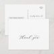 Este elegante cartão postal de agradecimento com letra é perfeito para um casamento simples. O design minimalista em preto e branco apresenta uma tipografia romântica sofisticada com um estilo moderno e glamoroso. Personalizável em qualquer cor. Mantenha o design minimalista e sofisticado, como está, ou personalize-o adicionando seus próprios gráficos e ilustrações. Personalize o verso do cartão postal com seus nomes, seu endereço de retorno e uma mensagem de agradecimento. Alternativamente, deixe a seção do modelo de mensagem de agradecimento em branco para escrever à mão uma nota personalizada e atenciosa em cada cartão após eles chegarem. Esses cartões podem ser usados para um casamento, chá de noiva ou qualquer evento especial.