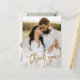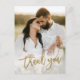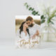 Este cartão de agradecimento de casamento moderno com 2 fotos apresenta agradecimento em letra dourada, mensagem pessoal e uma foto vertical na frente. O verso inclui uma segunda foto que é uma imagem horizontal sem bordas. Clique em editar para personalizar este design.