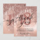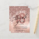 Cartão de agradecimento de festa de 18 anos moderno. O design apresenta brilho falso em rosa dourado e fundo de folha metálica com gotas de glitter cintilante e tipografia ''obrigado'' na frente e dezoito no verso. Personalize com sua mensagem de agradecimento, data e nome.
