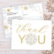 Compartilhe sua gratidão com este lindo cartão postal de agradecimento de inverno, apresentando escrita dourada brilhante e um delicado centro de floco de neve. O design de dupla face inclui espaço para uma mensagem sincera e endereço de envio, tornando-o bonito e prático. Perfeito para chás de bebê de inverno, chás de férias e celebrações de pequenos flocos de neve. Coordena-se perfeitamente com a coleção completa Snowflake Baby Shower para um tema coeso de Winter Wonderland.