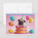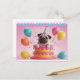 Celebre um dia especial com este incrível cartão de aniversário de pug 3D! Apresentando um filhote hilário saindo de um bolo gigante com balões e confete, este design único e vibrante é perfeito para amantes de cachorros. Um cartão obrigatório que fará qualquer um sorrir!