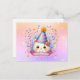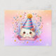 Celebre seu dia especial com nosso cartão postal de aniversário do gato Kawaii Kitty Cat! Gato adorável usando um chapéu de festa em meio a confetes em um fundo brilhante pastel. Perfeito para os amantes de gatos!