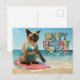 Celebre com estilo ensolarado com este adorável cartão postal de aniversário na praia com um gato siamês glamoroso em um traje praiano, cercado por ondas, Perfeito para enviar votos de aniversário para amantes de gatos que adoram vibrações costeiras e charme felino. Ideal para mães de gatos, garotas da praia ou qualquer pessoa que festeje com patas na areia.