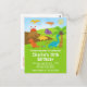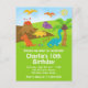Adoráveis dinossauros apresentando um braquiossauro azul, tiranossauro laranja, estegossauro amarelo, triceratops roxo e pterodáctilos amarelos e laranja. Ao fundo, um vulcão, luz solar, céu e nuvens, palmeira, pegadas de dinossauro e ovos.