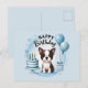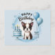Torne o dia especial deles perfeito com este encantador cartão postal de aniversário do Boston Terrier! Com um adorável filhote de Boston Terrier marrom e branco, um bolo de aniversário azul listrado, balões alegres e uma caixa de presente, este design combina charme e celebração em um cartão de lembrança.