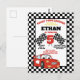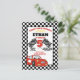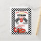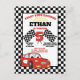 Cartão postal de convite de aniversário infantil de carro de corrida vermelho xadrez preto e branco