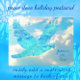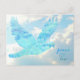 Um pombo azul vibrante, criado com uma aparência de renda geométrica, voa através de nuvens ondulantes e céu azul. A mensagem na frente diz "paz, alegria, amor". A mensagem pré-definida no verso diz: Desejos de um Feliz e Saudável Ano Novo. É fácil personalizar esta mensagem e também há um modelo para o seu nome.