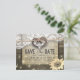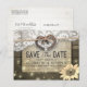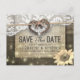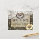 Modelos de Cartão Postal de Compromisso de Casamento em Estilo Rústico Country Moderno - Casal com Ferradura Antiga e Coração com Laço de Corda e Renda Branca, Girassol, Luzes de Corda e Tecido de Estopa sobre Fundo de Madeira de Celeiro Antigo.
