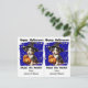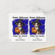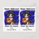 Este cartão-postal bonitinho de Halloween foi projetado para ser facilmente cortado em duas cartas. A imagem é de um filhote preto, marrom e branco bonitinho vestido com um chapéu de bruxa com duas lanternas ao seu lado. A imagem é colocada sobre um fundo azul real com estrelas douradas dispersas. O texto negro acima diz "Feliz Dia das Bruxas", e abaixo "Aproveite a Tia" com sua assinatura. Perfeito para que os alunos do ensino fundamental ou pré-escolar deem aos seus amigos na festa de Halloween da escola, e também econômico! E os professores também podem personalizá-lo para dar aos alunos.