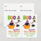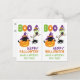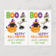 Este lindo cartão postal de Halloween foi projetado para ser facilmente cortado em dois cartões. A imagem é de um pequeno gatinho preto usando um chapéu de bruxa e sentado dentro de uma abóbora de Halloween. Perto do gatinho há uma coruja verde em um galho, e uma pequena aranha preta pendurada nele. O texto estilizado acima diz BOO em verde, laranja e roxo. Na parte inferior estão dois campos de texto personalizados. O verso tem seu texto personalizado e outra imagem do gatinho. Perfeito para professores do ensino fundamental ou pré-escolar dar aos alunos na sua festa de Halloween, e também econômico! Ou deixe que seu próprio filho os dê aos amigos da escola.