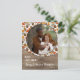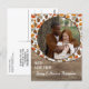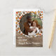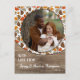Cartão de Férias de Ação de Graças único, sofisticado, moderno, bonito e decorativo. Cute COM AMOR DE texto e espaço para personalizar ou personalizar com uma foto e nomes (ou nome da família) de sua escolha. Com padrão clássico de folhas botânicas de laranja, vermelho e marrom de outono quente e um design de fundo com estilo de madeira desgastada de fazenda. E um poema de saudação de outono atencioso personalizável no verso do cartão.