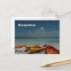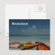 Este cartão mostra uma foto de caiaques coloridos descansando numa praia de areia branca com milhas de água azul além.