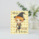 A bruxa de halloween e seu gatinho preto estão montando uma vassoura contra um fundo de milho doce em uma carta poste. Personalizável para que você possa alterar o texto se desejar.