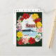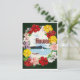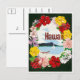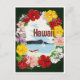 Este cartão-postal apresenta um brilhante e colorido design celebrando o Havaí. Uma vívida borda floral de hibisco e flores tropicais circunda uma ilustração de uma cena pacífica do oceano com um veleiro e uma canoa despoletada contra um pano de fundo montanhoso. A palavra Havaí é ousadamente exibida no centro, capturando o espírito das ilhas num estilo alegre e acolhedor