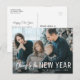 Cartão de feliz ano novo, moderno roteiro de pincel branco e uma bela foto. O texto, a imagem e as cores podem ser personalizados.