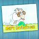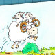 Este lindo cartão do Dia dos Pais desenhado em estilo de desenho animado mostra um carneiro saltando sobre um arbusto verde em pé em um prado, diante de um céu azul. O carneiro macho tem dois cordeirinhos em suas costas que claramente estão se divertindo muito com o pai deles. Abaixo deles, na grama, as palavras "Feliz Dia dos Pais" são escritas em letras manuscritas amarelas em negrito.