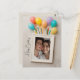 Este lindo cartão de aniversário bege "Feliz Aniversário" apresenta uma foto poloraid personalizável que é rodeada por balões coloridos e velas de aniversário. Você pode personalizar o design tanto carregando sua própria foto quanto inserindo seu próprio texto desejado.