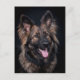 Cartão postal com um German shepherd Cachorro Alsaciano, ele é muito bonito, bonito, fofo e fofinho. Ele é um cão de cabelos compridos e cor escura.