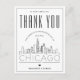 Uma forma excelente de mostrar apreço ao convidado que viajou tão longe do seu caminho para vê-lo, nesta bela cidade. Este obrigado especial que o seu cartão postal é adaptado ao convidado que esteve no seu casamento na bela cidade de Chicago, Illinois. Ele apresenta uma linha do horizonte estilizada da cidade na frente do cartão. Ao contrário, é um ponto para a sua mensagem exclusiva. Use as funções de personalização para adicionar uma foto, se desejar.