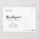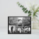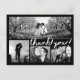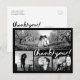Personalize esta Na moda Photo Obrigado Postcard, projetada com o moderno guião manuscrito divertido bold Texto branco Obrigado! a preto. Substitua a colagem de quatro imagens de modelo com suas 4 fotos favoritas. Uma das imagens é uma ampla foto panorâmica horizontal e as outras três são menores. Para obter melhores resultados, use fotos de alta resolução. Também mude todas as informações de modelo de ambos os lados com as suas. Esta design tem um texto: "Obrigado por partilhar no nosso dia especial." Você pode mudar as palavras com suas próprias palavras.